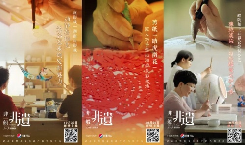 在联合推出纪录短片时,百事可乐还与人民日报合作推出三款非遗联名罐,将踏虎凿花、何氏皮影戏和醴陵五彩瓷三种非遗技艺,以焕然一新的姿态印在了百事可乐的蓝罐上。