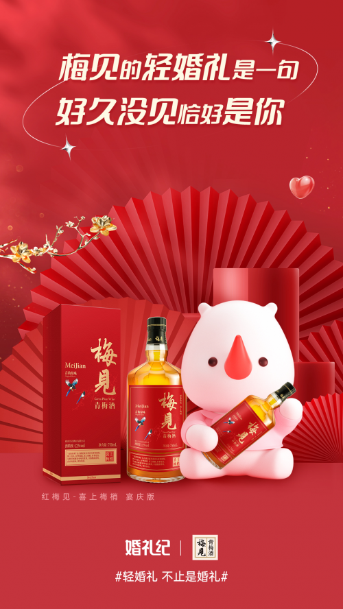 此次轻婚礼艺术节,不仅是梅见与婚礼纪一次品牌合作,更是一次基于文化基因的共创。梅见通过婚礼纪平台链接了更多年轻消费群体,与消费者建立更深层次的情感联结,也将表达国风文化的【红梅见-喜上梅梢 宴庆版】送到更多的年轻新人婚宴现场。