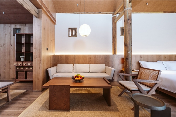 此外,院落中还用原木、藤编制品等其他传统元素刻画细节,同时大幅增加红砖老墙的面积,使历史感得以加深。