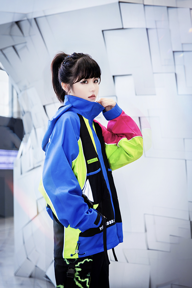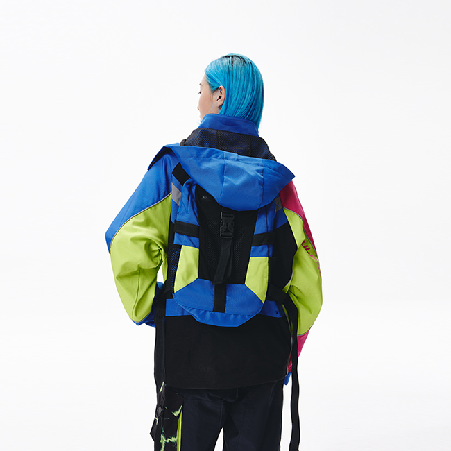 此番合作,LNG 透过虚拟视角被重新审视和融合,颠覆现实日常与传统的装扮。此次发布的 「2022 春夏系列」中则进一步验证了 LNG 为解放未来世代的超前设定。在 AYAYI 上身的两件系列单品中,LNG 「未来玩家」系列电竞风格外套表面呈现大颗粒荧光撞色风格,并在后背也运用了可拆卸式书包进行装饰。