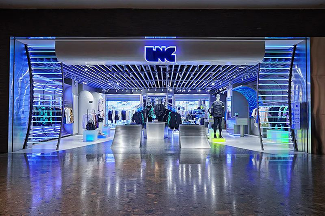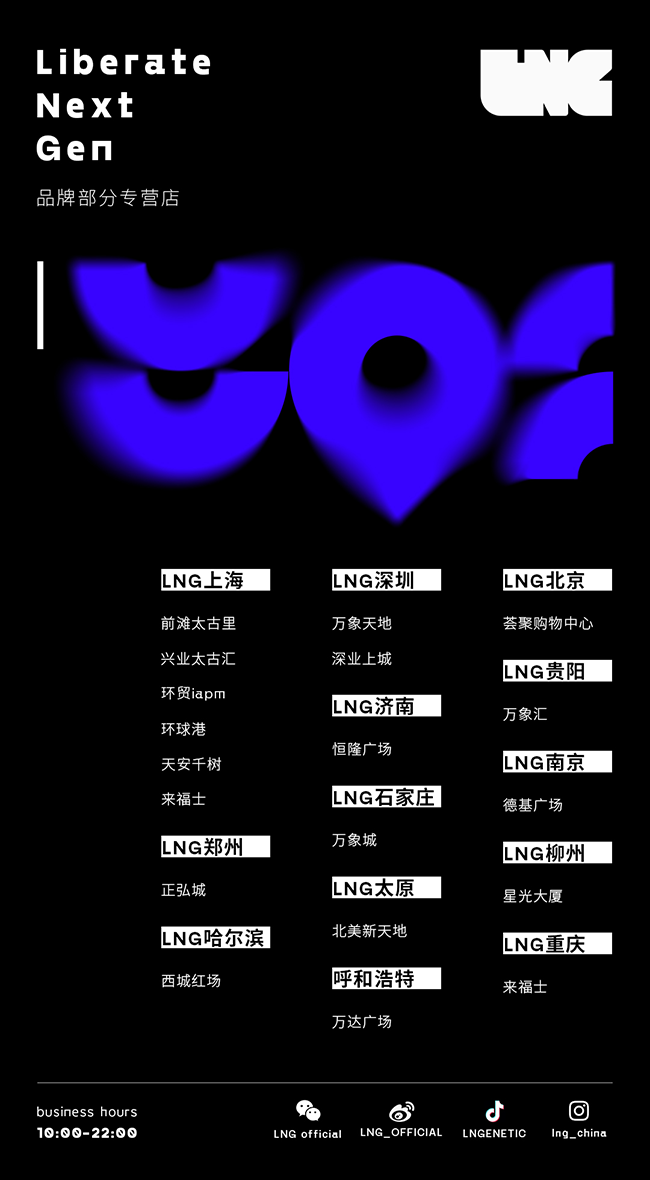 此外,全新视觉形象的 LNG 门店正式开幕!店内装潢采用散射状光线与霓虹色调,释放前卫的机能感,烘托 LNG 独树一帜的未来潮流感!