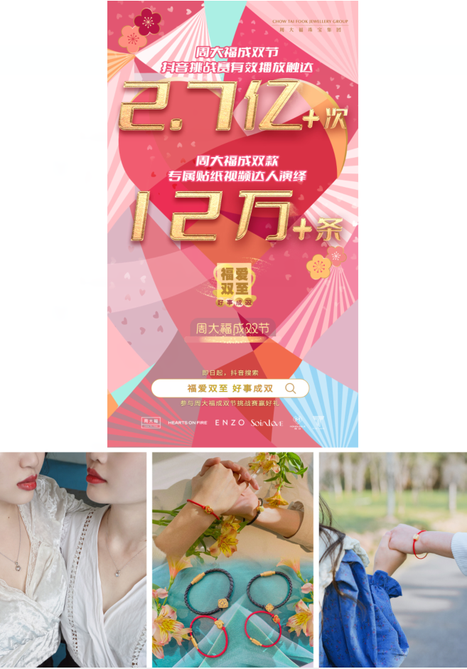 周大福致力将成双喜悦分享给每一位消费者,因此,在抖音及小红书社交平台,打造了一系列惊喜活动,将成双氛围拉至高潮。周大福成双节抖音挑战赛#福爱双至好事成双#,超2.7亿次话题浏览量有效播放触达,超12万条达人演绎周大福成双款专属贴纸视频,成为2月甜蜜话题引领者。同时,在小红书设立成双节体验官专属活动,#福爱双至好事成双#专属话题,超16.6万次浏览,#福爱双至# 话题中1万+篇笔记分享自己与所爱之人的精彩成双瞬间,让爱意充满2月。